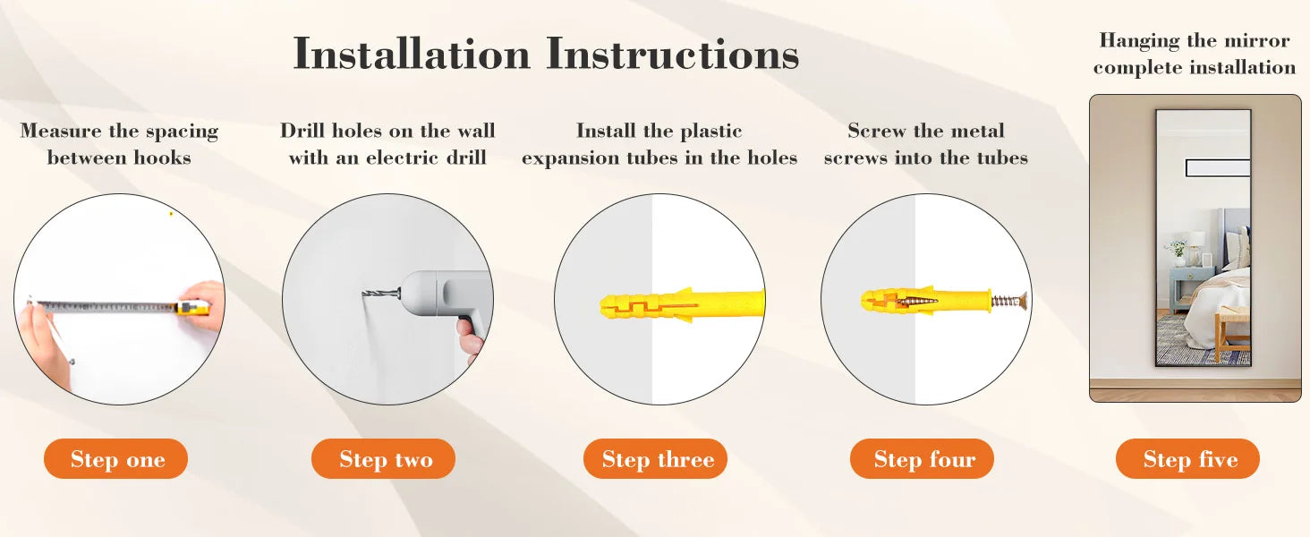 • ALL-MATCH: No Assembly Required. The floor length mirror can stand anywhere with the standing holder. You also can lean it against a wall, or you can hang it horizontally or vertically on the wall for space-saving. It is suitable for a bedroom, living room, cloakroom, home gym, corridor, clothing shop, etc.