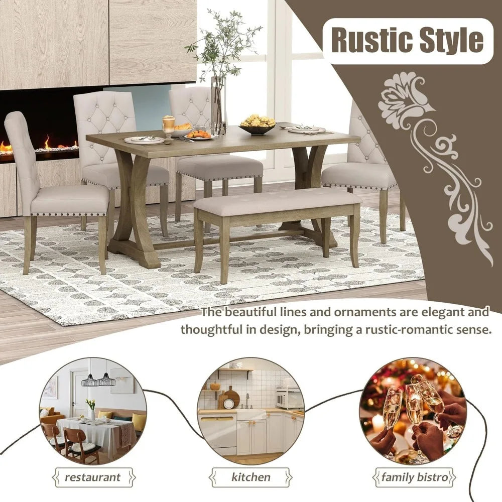 Set of 6, Farmhouse Dining Table with Chairs and Bench