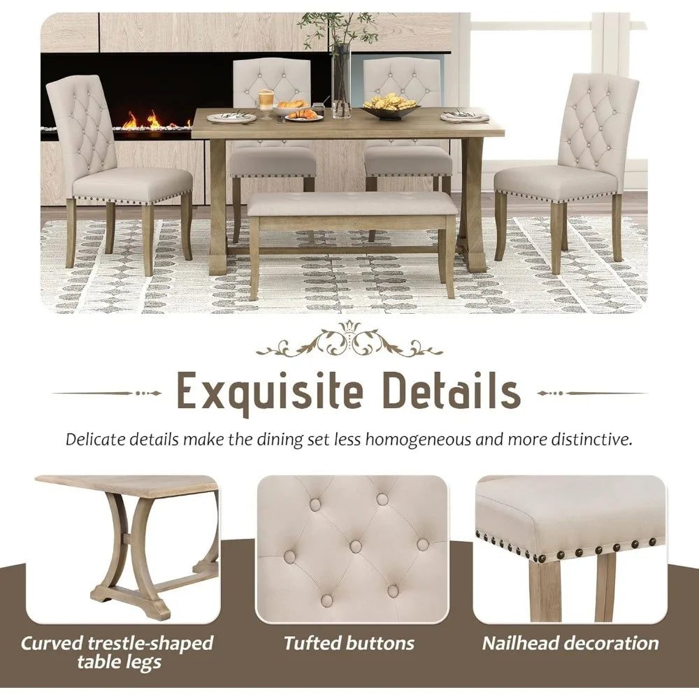 • [6-Piece Farmhouse Dining Table Set]: This 6-piece dining table set has beautiful farmhouse design and bring timeless refinement with a country touch to your dining room. This 6-piece dining table set includes one table, four dining chairs, and a bench in a beige finish that pairs well with any contemporary aesthetic. Whether hosting a dinner party with close friends or enjoying an everyday meal with the family, this dining table set is a must-have for your home.